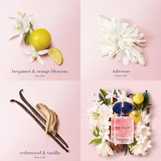 Парфюмната вода Armani My Way прониква в сетивата ви с цветно-дървесния си аромат. Първото, което ще усетите, е сладък цитрусов бергамот от Калабрия в съчетание с портокалов цвят от Египет. След това се разгръща упоителен аромат на бели цветя. Ще разпознаете дълбокия и упоителен жасмин и тубероза, брани в Индия. Чувственият финал се носи на вълната на топло кедрово дърво, бял мускус и ванилия от Мадагаскар.