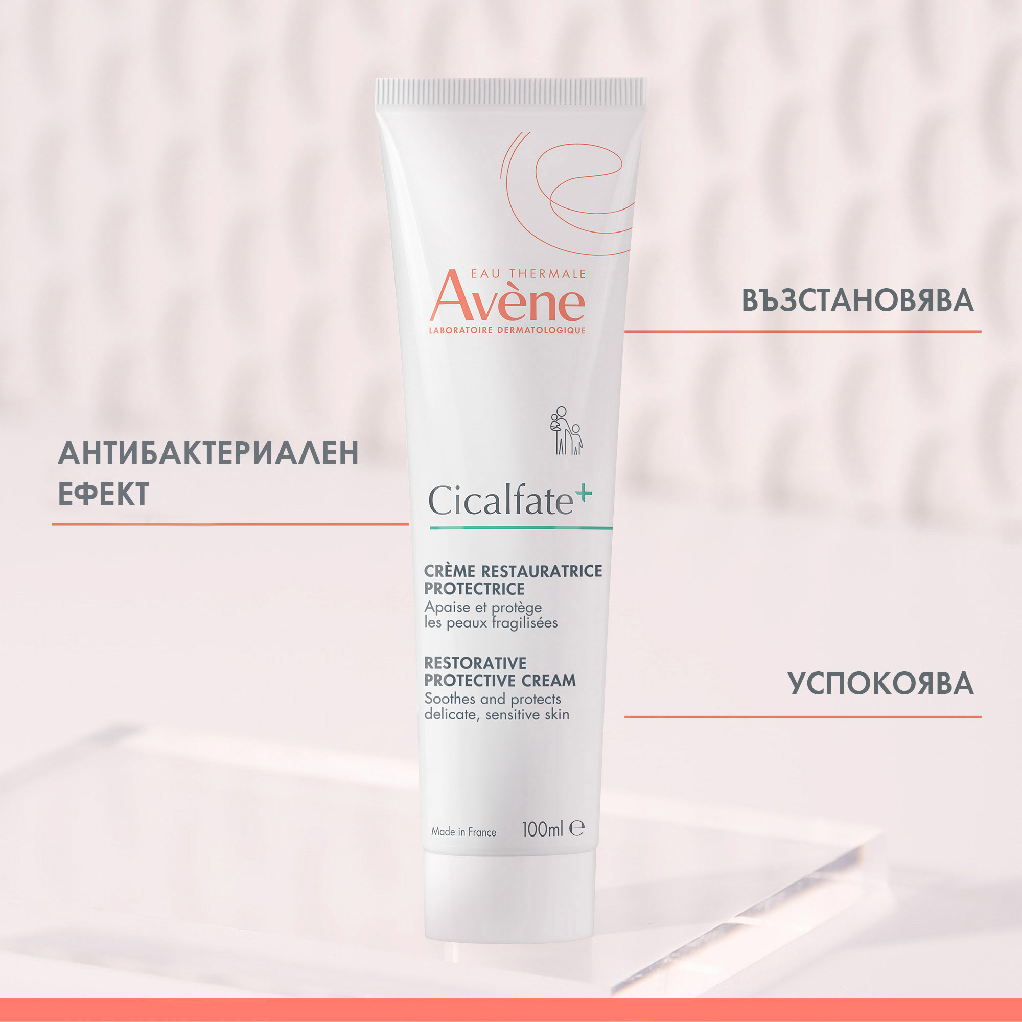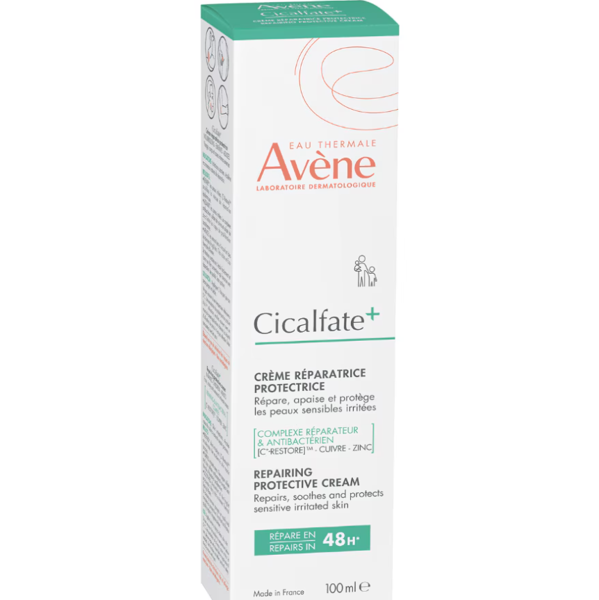 Avene Cicalfate+ Repair Cream for Sensitive and Irritated Skin е възстановяващ защитен крем за раздразнена чувствителна кожа. Кремът бързо възстановява, успокоява и защитава раздразнената кожа. Предназначене за възрастни, деца и кърмачета, чиято кожа е с неподмокрящи раздразнения. Продуктът е без аромати и без парабени, притежаващ възстановяващи и защитаващи съставки. Специалната формула съдържа Сукралфат, оригинална съставка, бързо възстановяваща комфорта на кожата. Комбинацията от меден и цинков сулфат ограничава риска от бактериален растеж. Термалната вода Avène в продукта успокоява наранената кожа. Авен Цикалфат+ Възстановяващ защитен крем е с много висока толерантност. Без парабени. Дерматологично тестван продукт. Хипоалергенен. Некомедогенен.