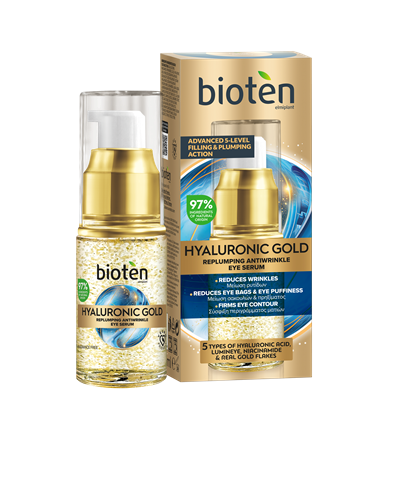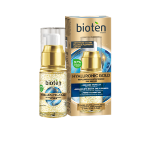 Bioten HYALURONIC GOLD уплътняващ околоочен серум против бръчки таргетира бръчки, торбички под очите, подпухналост и тъмни кръгове в деликатната зона около очите.