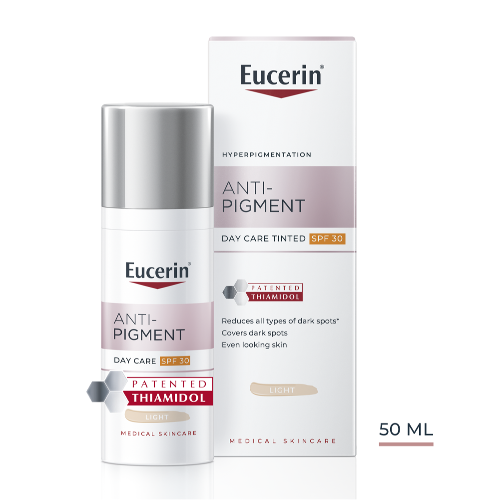 Eucerin Anti-Pigment Tinted Day Cream SPF30 Light е висококачествен оцветен дневен крем за лице, специално предназначен за пигментирана кожа. Кремът подхранва и хидратира кожата през целия ден, като я защитава от фотостареене и пигментация вследствие на влиянието на UVA и UVB лъчите. Специалната формула съдържа Thiamidol, който редуцира прекомерното производство на меланин - основният причинител на тъмните петна. Съставката намалява пигментирането и предотвратява повторната поява на петна. Минералните цветни пигменти незабавно се сливат с цвета на кожата, за да покрият пигментните петна и придават на кожата естествен вид. Eucerin Anti-Pigment Tinted Day Cream SPF30 Light Анти-пигмент Дневен оцветен крем за лице със слънцезащитен фактор SPF30 Светъл нюанс изравнява тена на лицето, прикрива несъвършенствата и прави кожата гладка и сияйна. Има нежна текстура, която бързо се абсорбира от кожата, оставяйки деликатен аромат. Без парабени. Дерматологично тестван продукт. Некомедогенен.