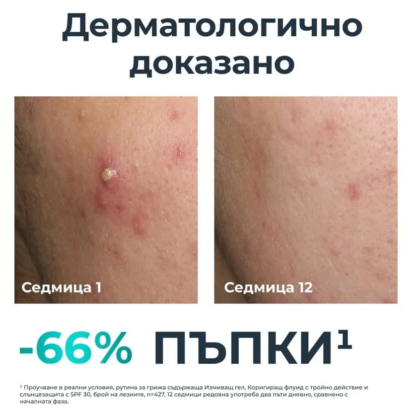 Формулата не е мазна и е некомедогенна (не запушва пори). Дерматологични проучвания доказват добра кожна поносимост и ефикасност на кожа, склонна към акне, и с петна, следствие от акне. Дерматологично доказано видимо редуцира петната след акне до 80%* и пъпките до 90%**. Видимо подобрява състоянието на порите до 71%**. Първи видими резултати след 2 седмици.