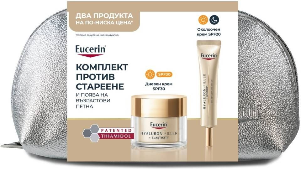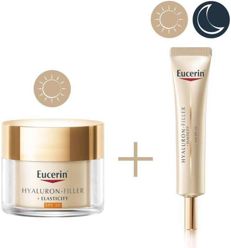 Eucerin Hyaluron-Filler + Elasticity Комплект при загуба на еластичност, дълбоки бръчки и възрастови петна Дневен крем SPF 30 50 ml + Околоочен крем SPF 20 15 ml