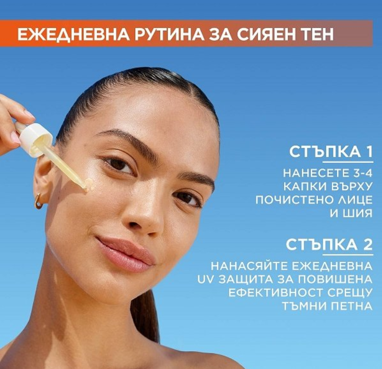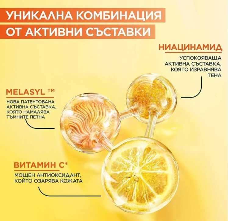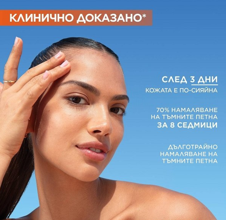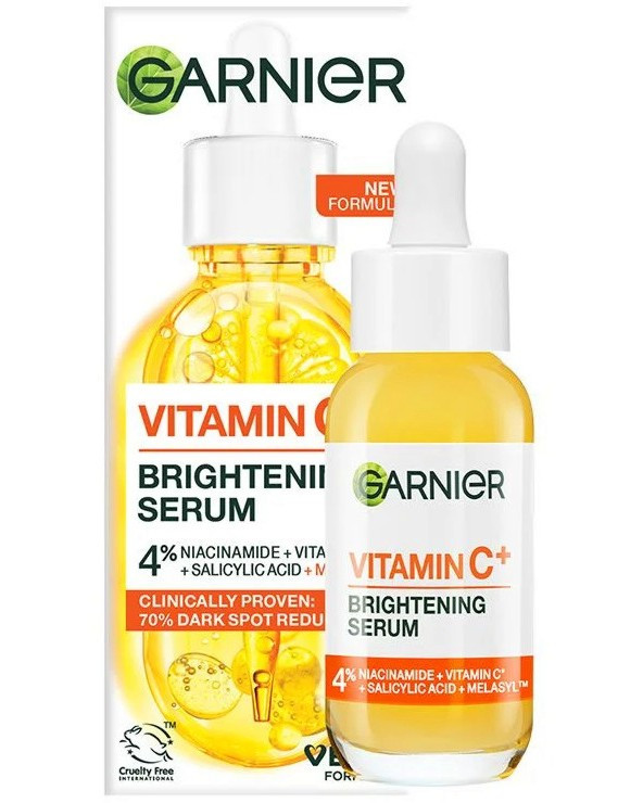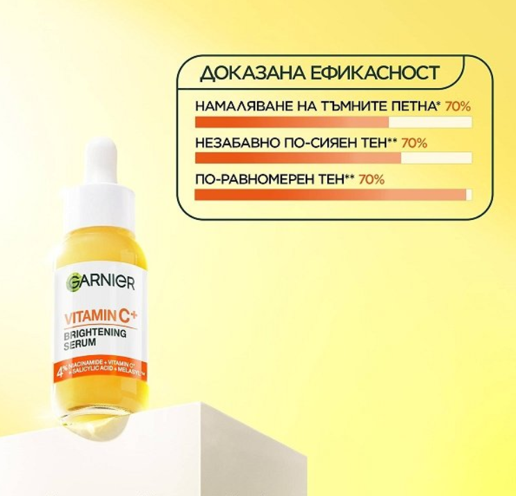 Специалистите от "Garnier" създават серум за лице, който прави кожата гладка и с равномерен тен. Той е изключително подходящ за повяхнала кожа, без блясък. Концентрираната формула съдържа витамин С, ниацинамид и салицилова киселина, които са известни със способността си да изсветляват пигментни петна и да стимулират производството на колаген, правейки кожата мека и гладка. Серумът осигурява блясък, уеднаквява тена и намалява видимостта на тъмните петна само за 6 дни*.