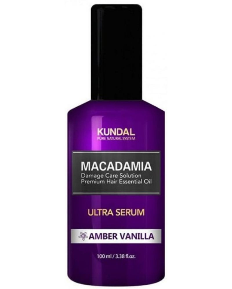 Kundal Macadamia Ultra Serum Amber Vanilla е серум за коса, обогатен с 15 натурални маслени екстракти, включително масло от макадамия, авокадо, кокос и арган. Този продукт е създаден за хора със суха и заплитаща се коса, осигурявайки копринена мекота и здравина на косъма. Формулата му не съдържа вода или алкохол, а само подхранващи съставки, които увеличават еластичността на косата и я хидратират в дълбочина. Благодарение на високата концентрация на масло от семена на макадамия (10,000 ppm), серумът доставя жизненоважни хранителни вещества и оставя дълготраен аромат на ванилия.