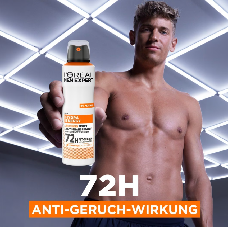 L'Oréal Paris® Men Expert® Hydra Energetic Extreme Sport спрей против изпотяване, подсилен с активатор за свежест за 72 часа против миризма и 48 часа против изпотяване, е подсилен с нашия активатор за свежест за -3,8º усещане за свежест на кожата. Този спрей може да се прилага върху подмишниците за дълготрайна свежест. Формулиран със свеж и енергизиращ аромат, тестван под дерматологичен и офталмологичен контрол.