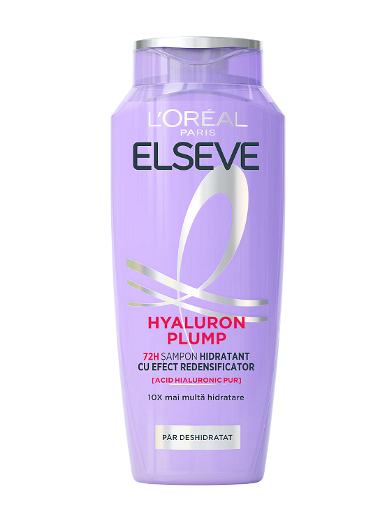 L’OREAL PARIS ELSEVE HYALURON PLUMP ШАМПОАН ЗА ДЕХИДРАТИРАНА КОСА, ОБОГАТЕН С ХИАЛУРОНОВА КИСЕЛИНА. Възстановява плътността на косата и осигурява хидратация до 72 часа **. Косата е по-блестяща, 10 пъти по-хидратирана** и ревитализирана, без утежняване.Рециклируема и 100 рециклирана* пластмасова бутилка. *С изключение на капачката и боята. **Инструментална тест, шампоан + балсам.