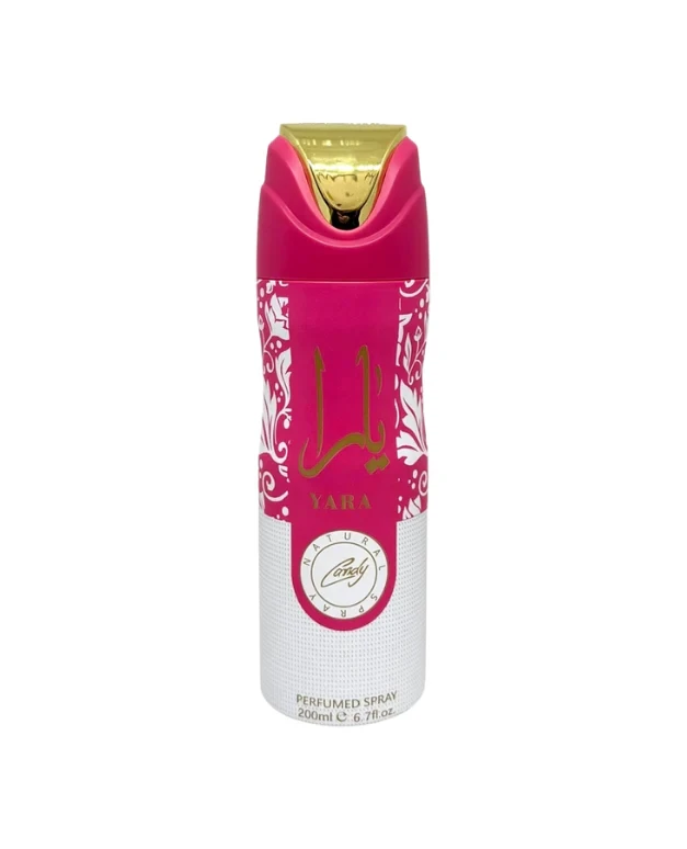 Парфюмният Дезодорант спрей Yara Candy е луксозен и дълготраен аромат, който ви държи свежи и уверени през целия ден. Този аромат майсторски съчетава плодови, флорални и гурме нотки, за да създаде неустоимо и радостно ухание. Ароматът се отваря с изблик на сочна зелена мандарина и плодове от касис, водещи в сърце от цъфтящи бонбони комбиниращи вкусовете на гардения и ягода / Gardenia & Strawberry Fizz Candy/. Финалните базови нотки запечатват детската игривост ,с изисканост и чар ,където ванилов сироп с кехлибар се смесват със сандалово дърво и мускус