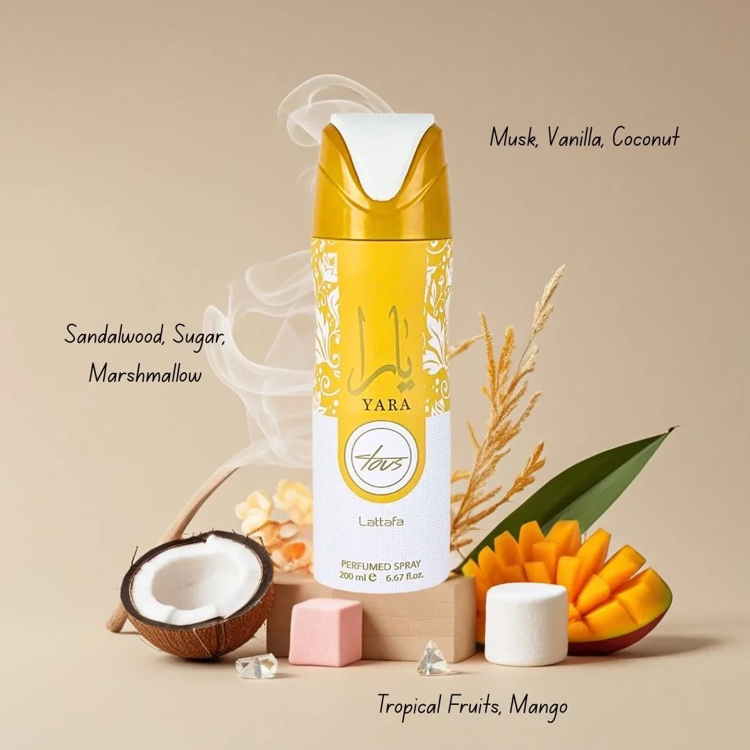 Aроматът на парфюмния дезодорант Yara Tous се отваря с мека, кремообразна смес от мускус, ванилия и кокос, предизвикваща топло и екзотично усещане. В сърцето, сладкото богатство на сандалово дърво, захар и ружа създава възхитителен, игрив контраст. Базата е тропически рай със сочни, жизнени нотки на манго и други тропически плодове, добавящи свеж, плодов привкус. Този аромат е идеален за тези, които се наслаждават на сладък, тропически аромат с уютен, гурме подтекст.
