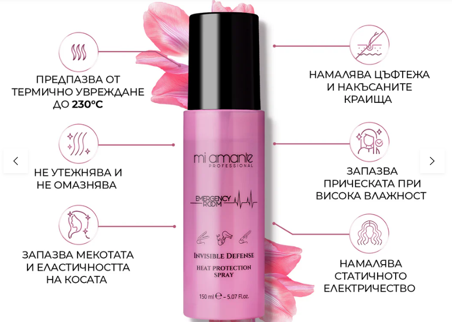 Mi Amante Invisible Defense е лек и ефективен термозащитен спрей, създаден да предпази косата от вредното въздействие на високите температури при сушене, изправяне и къдрене. Създава невидим защитен филм, който изглажда косъма, намалява накъдрянето и статичното електричество, без да го утежнява. Идеален за всекидневна употреба – самостоятелно или в комбинация с крема Ella, който добавя UV защита, лекува и подхранва косата и поддържа прическата жизнена, защитена и дълготрайна.