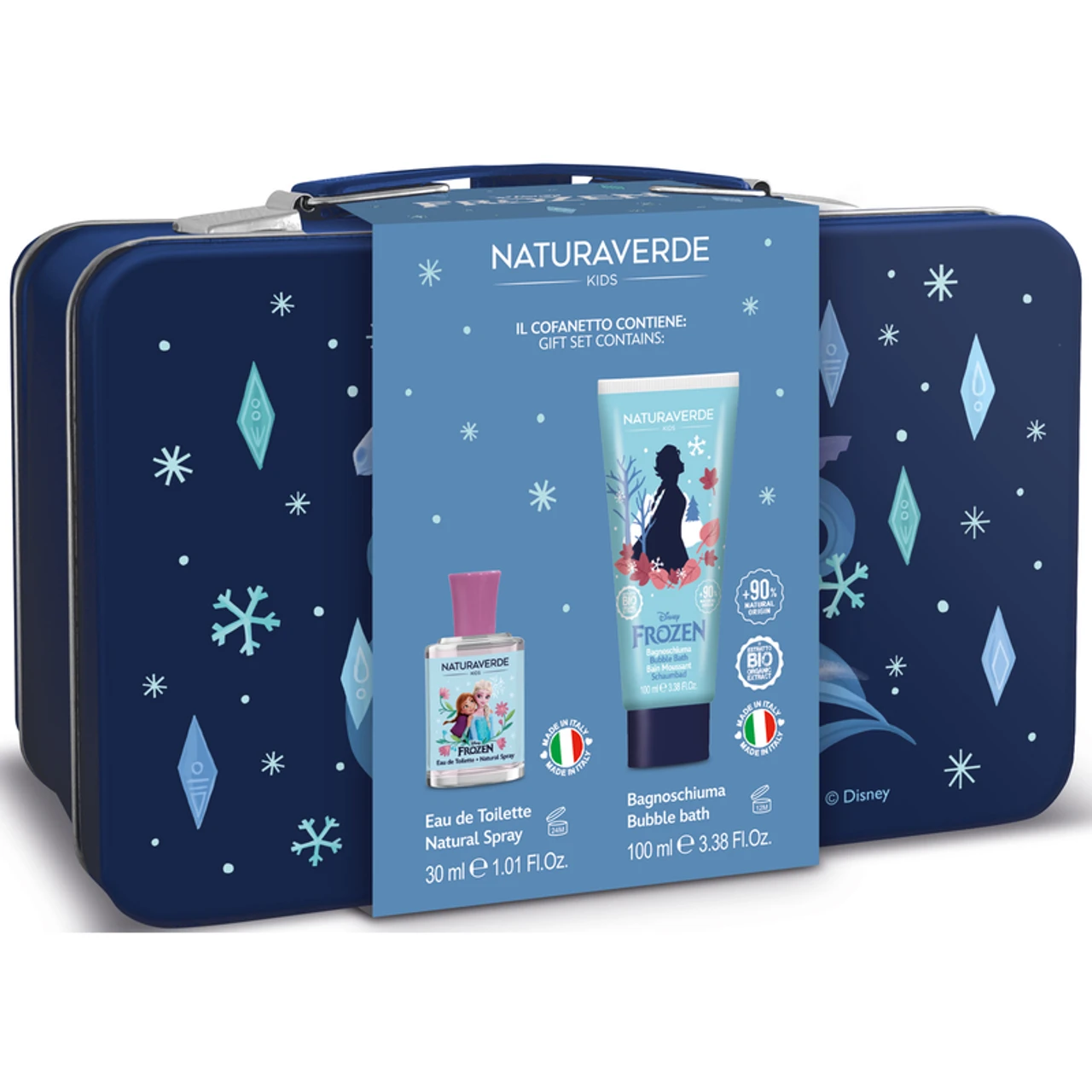 Подаръчен комплект, с който ще зарадвате малките госпожици. Комплекта включва пяна за вана която превръща къпането в забавление .Детската тоалетна вода е с нежен свеж аромат .Металното куфарче с инкрустирана рисунка на Frozen е идеален аксесоар за съхранение на детски гримове.