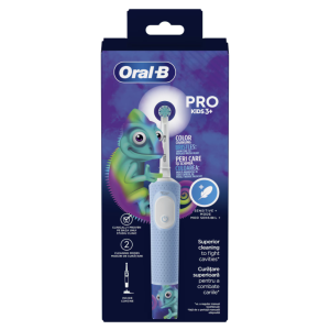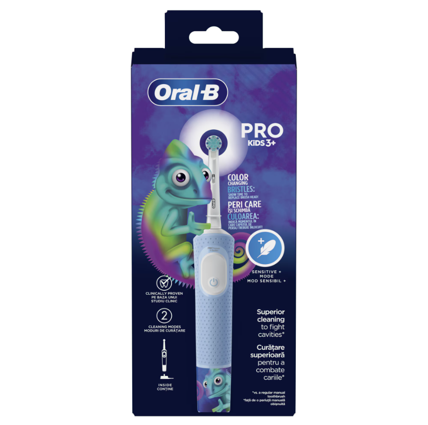 Oral-B Pro Kids Chameleon е електрическа четка за зъби за деца над 3 години. Тя е удобна за използване и предлага нежно и ефективно почистване. Има два режима на работа и премахва повече бактериална плака в сравнение с механичната четка за зъби. Когато индикаторните влакна се обезцветят, това е знак да смените главата на четката си за по-добро почистване. Четката има индикатор за нивото на заряд на батерията. Oral-B Kids Chameleon е снабдена с 4 тематични стикера, които правят четката интересна и привлекателна за децата. Четката може да се свърже със смарт приложения, които по един забавен начин дават възможност на децата да играят ролята на таймер за четкането на зъбите.