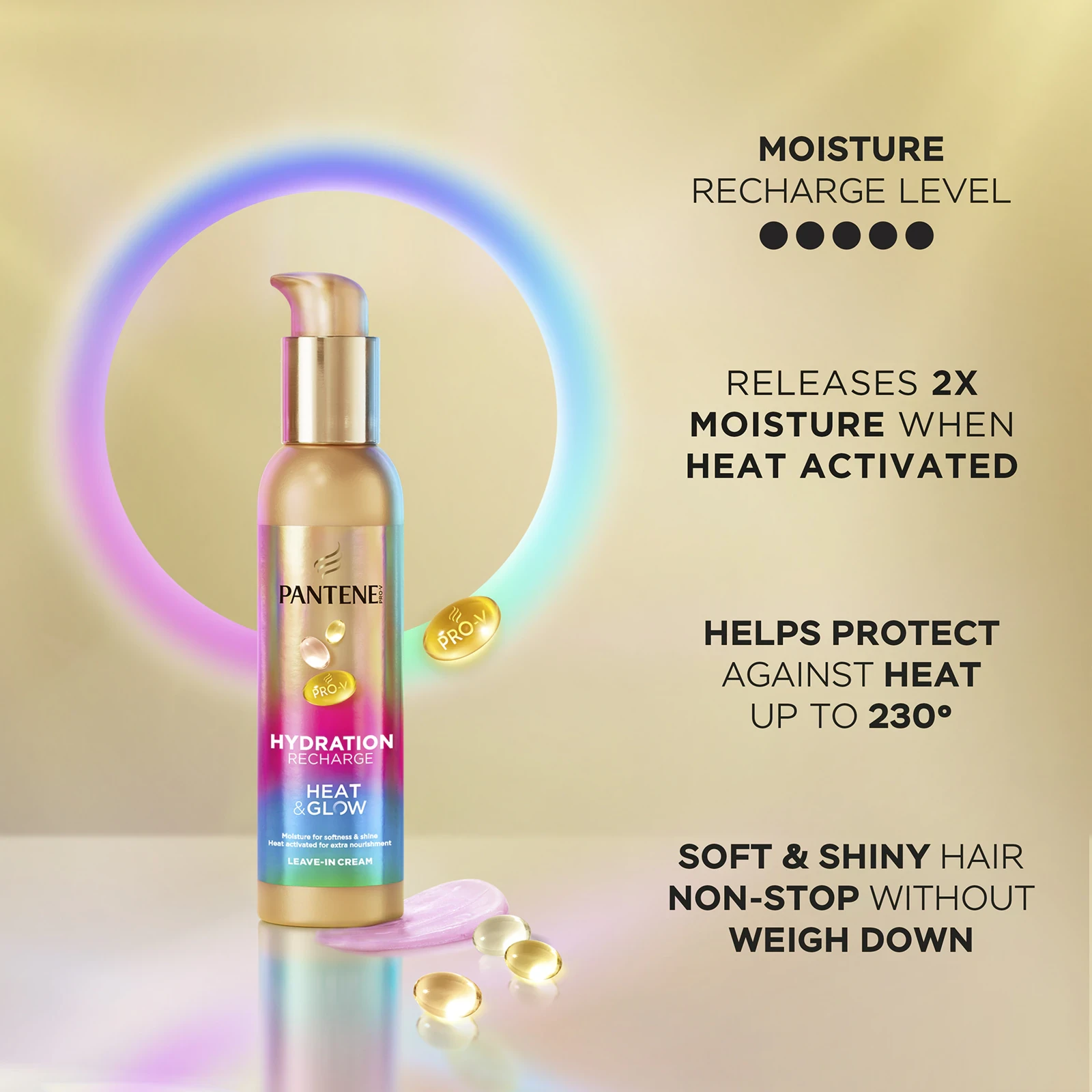 Pantene Pro-V Hydration Recharge Heat & Glow Serum е иновативен серум без отмиване, предназначен за суха, увредена и склонна към накъдряне коса. Благодарение на своята термоактивирана Pro-V формула, той интензивно хидратира и подхранва, като топлината освобождава още повече подхранващи съставки, които проникват дълбоко в косата. Осигурява термична защита до 230°C , като същевременно създава невидима бариера срещу влага и накъдряне. Резултатът е мека, гладка и блестяща коса , която запазва своята лекота и естествена свобода, без да я утежнява. Серумът може да се използва върху влажна коса преди стилизиране, за да активира подхранващото му действие, или върху суха коса между измиванията, за да намали накъдрянето и да дефинира къдриците. Този универсален продукт осигурява хидратация, защита, контрол на накъдрянето и красив блясък , оставяйки косата здрава и жизнена всеки ден.