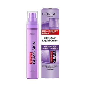 Кремът за лице L’Oréal Paris Revitalift Filler Glass Skin подпомага естествените функции на кожата, поддържа я в баланс и с достатъчната хидратация допринася за цялостно по-здравия ѝ вид. За 100 часа хидратация и сияен вид? Изглажда фините линии. Glass Skin е корейски тренд за плътна, сияйна и гладка кожа, която отразява светлината. Постигнете Glass Skin ефект, който трае до 5 дни, с помощта на течната грижа Glass Skin, разработена от азиатските лаборатории на L’Oréal Paris. ВДЪХНОВЕН ОТ КОРЕЙСКИЯ GLASS SKIN ТРЕНД, С ТЕХНОЛОГИЯ FUSIOGLYDETM . РЕЗУЛТАТИ: Абсорбира се за 5 секунди и осигурява 100 часа хидратация2. Веднага след употреба: Кожата е по-сияйна, +93% хидратация, изглежда по-свежа и по-здрава. След 6 седмици: Кожата изглежда по-плътна, фините линии изглеждат намалени, а кожата е по-гладка на допир.