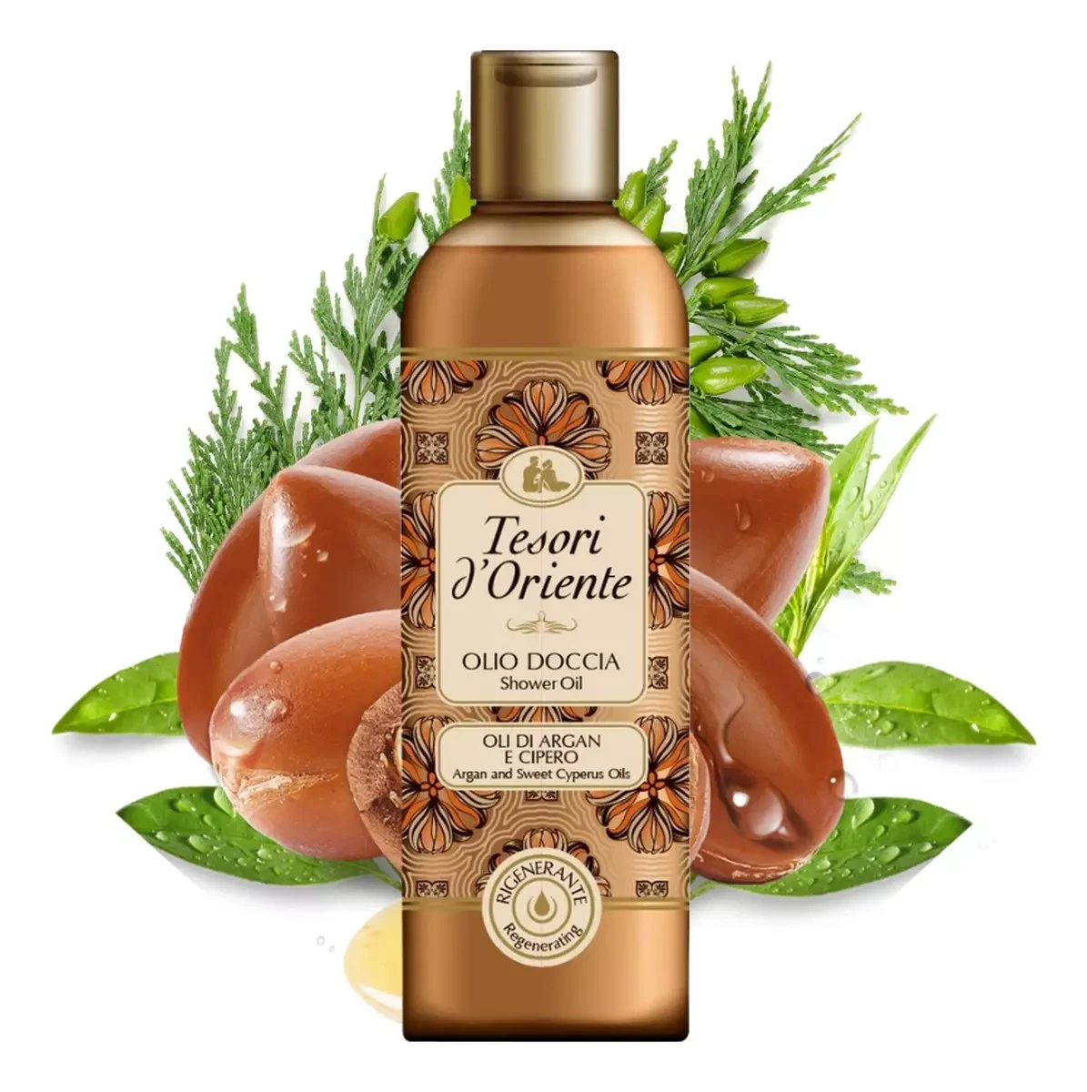Tesori d' Oriente Shower Oil with Argan and Cyperus Oils Regenerating е страхотно висококачествено възстановяващо душ олио за тяло с арганово масло, което придава зашеметяваща мекота и нежност на кожата, разкрива естествената ѝ сияйност и я дарява с благоуханно усещане и свежест. Разработената формула почиства отлично натрупалите се замърсявания, обновява кожата и я подхранва в дълбочина. Същевременно регенериращите свойства на съставките спомагат за поддържането ѝ с гладка, кадифено мека и нежна визия. Деликатната текстура на душ олиото е лесна за нанасяне и приятна за употреба. След използване тялото е успешно почистено, освежено и с усещане за комфорт и лекота.