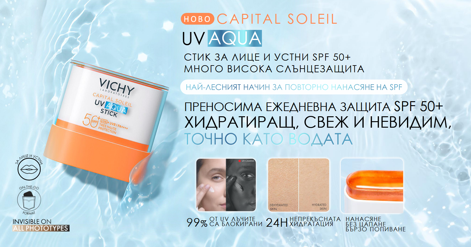 Vichy Capital Soleil UV Aqua Invisible Sun Stick Face SPF50+ e стик за лице и устни с много висока защита срещу UVA и UVB лъчи. Обогатен с ексклузивната вулканична вода на Vichy, той помага за укрепване и хидратиране на кожата, осигурявайки освежаващо усещане при всяко нанасяне. Освен това, формулата включва Mexoryl XL, мощна съставка, известна със своята широкоспектърна слънцезащита, гарантираща, че кожата ви е защитена от стареене, предизвикано от слънцето. Включването на витамин Е добавя антиоксидантен слой, помагайки за неутрализиране на свободните радикали и насърчаване на по-гладък и по-устойчив тен. Vichy Capital Soleil UV Aqua Invisible Sun Stick SPF50+ има копринена, немазна текстура, която се плъзга без усилие по кожата, без да оставя бели следи или лепкаво усещане. С удобния си, преносим формат, този слънцезащитен стик е идеален за освежаване в движение, гарантирайки, че ще останете защитени, независимо къде ви отведе денят. Подходящ за всеки тип кожа. Без парабени. Продукът е тестван под дерматологичен контрол. Водоустойчив. Хипоалергенен.
