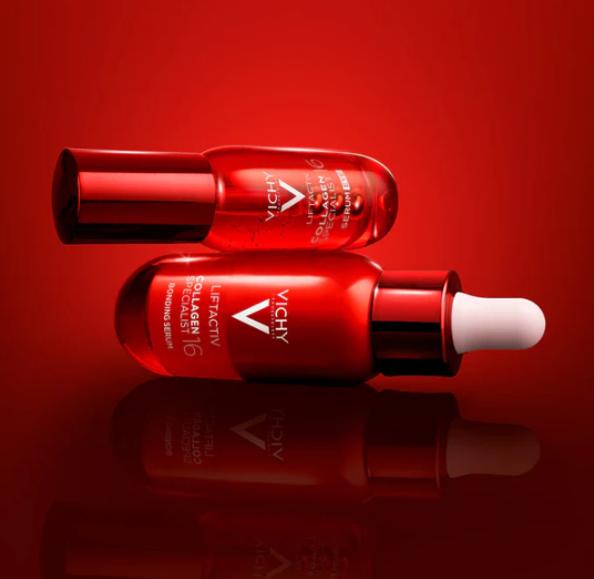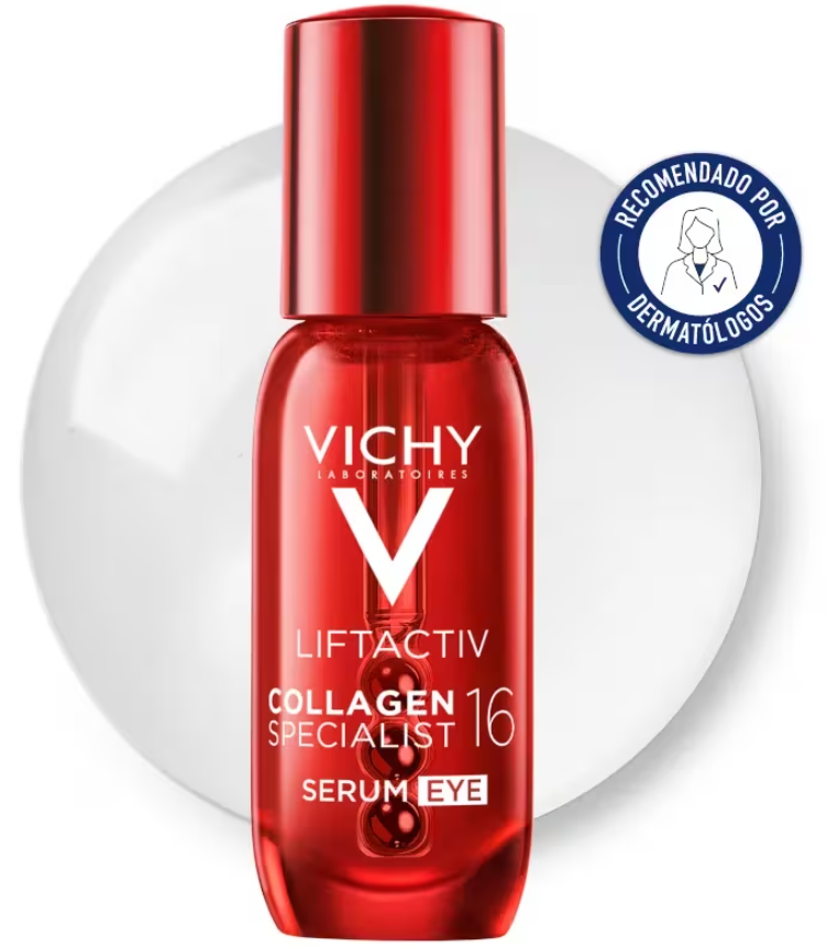 Vichy Liftactiv Collagen 16 Eye Serum е серум за околоочния контур, който е насочен към 16-те видими признака на стареене в зоната на очите, използвайки технология Co-Bonding; комбинира рамноза, пептиди и майтаке за подобряване на тъмните кръгове, подпухналостта, фините линии и тена на кожата, и съдържа съставки, предназначени да хидратират, омекотяват и стягат кожата, като спомагат за намаляване на бръчките и признаците на умора; подходящ за всички типове кожа, включително чувствителна, хипоалергенен и без аромат; описан като първият серум за очи, който подсилва и свързва всички видове колаген и подмладява зоната на очите за 2 седмици; опаковката е с троен апликатор, който осигурява хладно, ревитализиращо усещане при нанасяне.