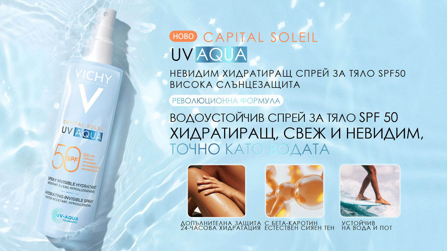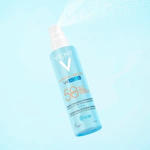 Открийте спрея за тяло Vichy Capital Soleil UV Aqua SPF50, с хидратиращ невидим завършек, който се усеща свежо като вода. Осигурява висока защита срещу UVA + UVB + дълги UVA лъчи. Формулиран с UV Aqua технология: Хидратиращ, свеж и невидим, точно като вода. Когато кожата е изложена на слънце, тя претърпява истинско изпитание, сравнимо с това, когато деликатна тъкан е изложена на интензивен източник на топлина. Vichy Capital Soleil UV Aqua Invisible Moisturizing SPF50 действа като течен щит, способен да се разтопи в повърхността на кожата, създавайки защитна бариера срещу UV лъчите. Воднистата му текстура създава усещането за нанасяне на прясна вода, като едновременно с това осигурява ефективна и равномерна слънцезащита.